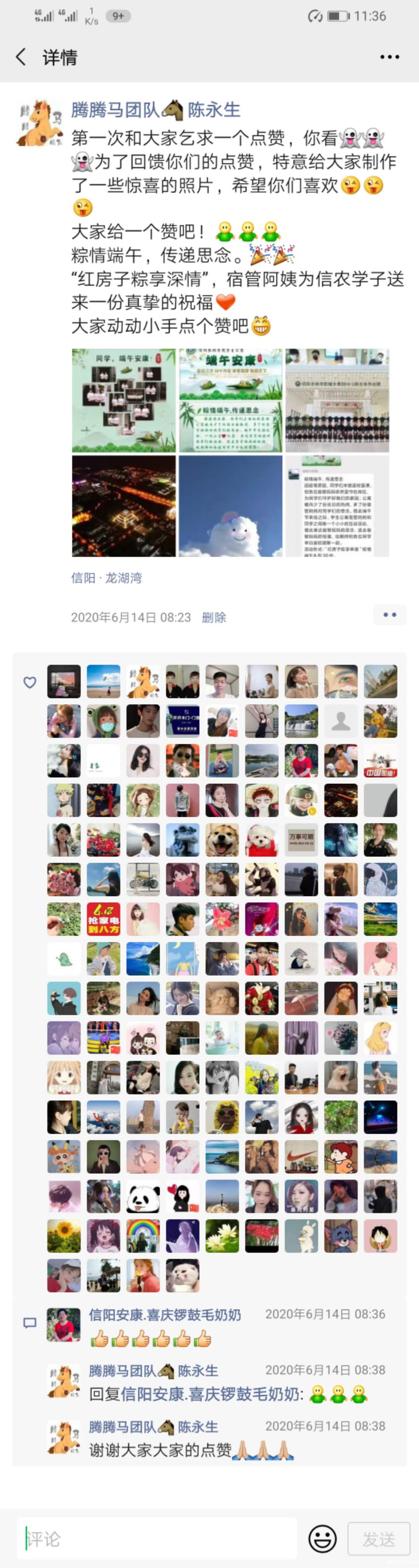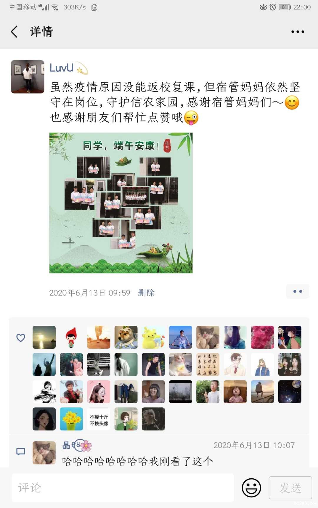 在端午佳节即将来临之际,因疫情原因,学生未能返校复课,公寓内少了往日的热闹,为表达宿管妈妈们对同学们的思念,后勤公寓管理与服务中心开展了“粽情端午,传递思念”活动。活动一开始就在学生中引起强烈的反应,第一天便有上千名学生参加活动,纷纷在朋友圈中纷纷表达自己对宿管妈妈们的思想,截至6月18日活动结束,参加活动的同学已经有近1万余人,各朋友圈点赞量累积近2.5万,获得了学生和家长的一致好评,目前宿管妈妈们为学生们准备的爱心粽子和鸭蛋正陆续通过邮政快递寄往学生们的手中。