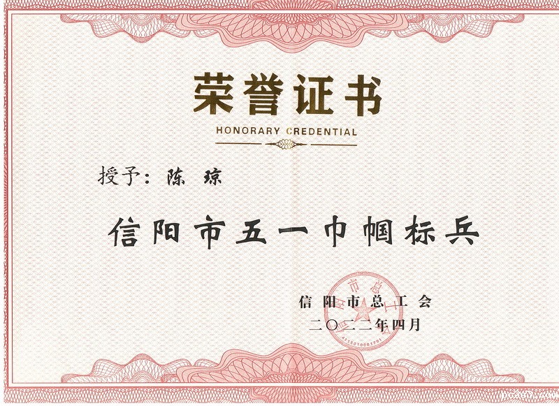 近日,信阳市总工会下发《关于表彰信阳市五一巾帼标兵岗、五一巾帼标兵的决定》(信工文〔2022〕22号),我校工会推荐的制药工程学院教师陈琼被授予信阳市“五一巾帼标兵”荣誉称号。