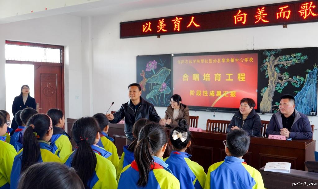 为深入贯彻习近平总书记关于教育的重要论述以及学校美育工作的重要批示精神,切实落实河南省教育厅组织实施的全省乡村中小学“以美育人,向美而歌”合唱培育工程,1月8日,我校艺术教育中心主任张立恒、副主任何鑫率帮扶团队前往固始县黎集镇中心学校,开展合唱培育工程阶段性成果汇报,黎集镇中心学校校长裴静、校本部校长梁光利及全体音乐教师参加。活动由裴静主持。