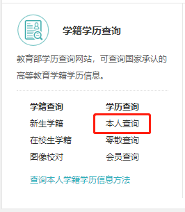 毕业时间在2002年之后的高等教育毕业证书(包括研究生、普通本专科、成人本专科、网络教育、开放教育、高等教育自学考试以及高等教育学历文凭考试等),登录中国高等教育学生信息网,点击“学籍学历查询-本人查询”。